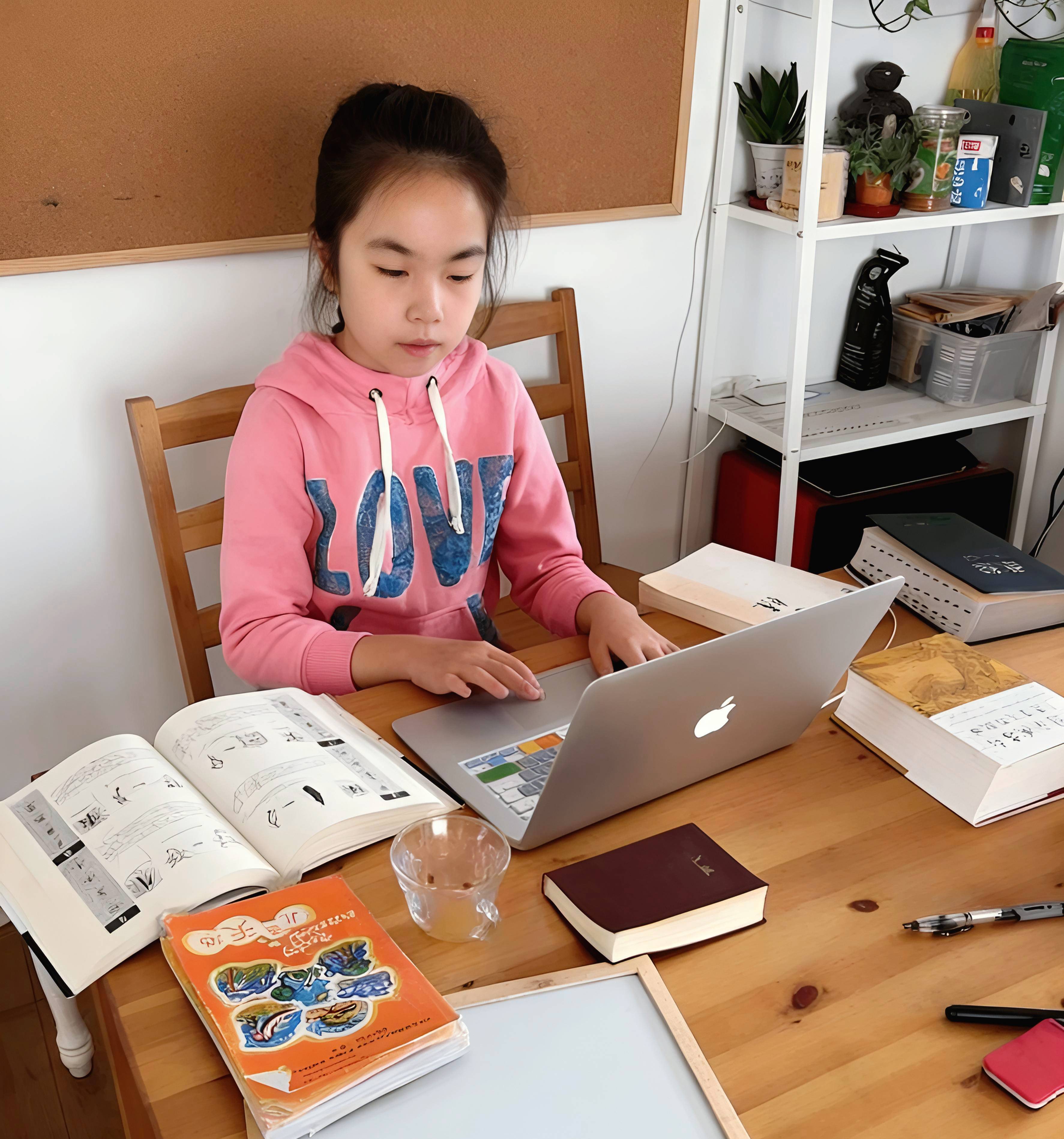 每天中午前后,五年级的Joy总是忙着准备网络教学的PPT,一小时后她就要用中文或英文在网络上进行教学直播。“汉字的起源”、“Joy姐姐教英语”是她目前正在直播的课程。从课程的设计,配图的选择,到和妹妹在课程中的角色扮演,甚至配乐,妈妈老师都会鼓励她们俩独立完成,只在必要时向妈妈求助。姐妹俩就像芝麻街里的大鸟和艾蒙一样,配搭得轻松有趣。